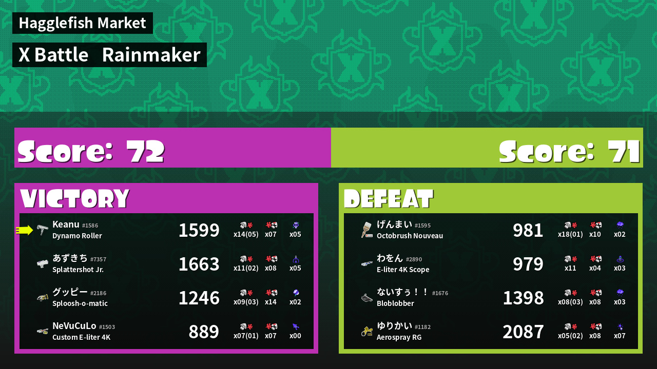 | Medals | #1 Overall Splatter #1 Enemy Splatter #1 Splat Assister | ||