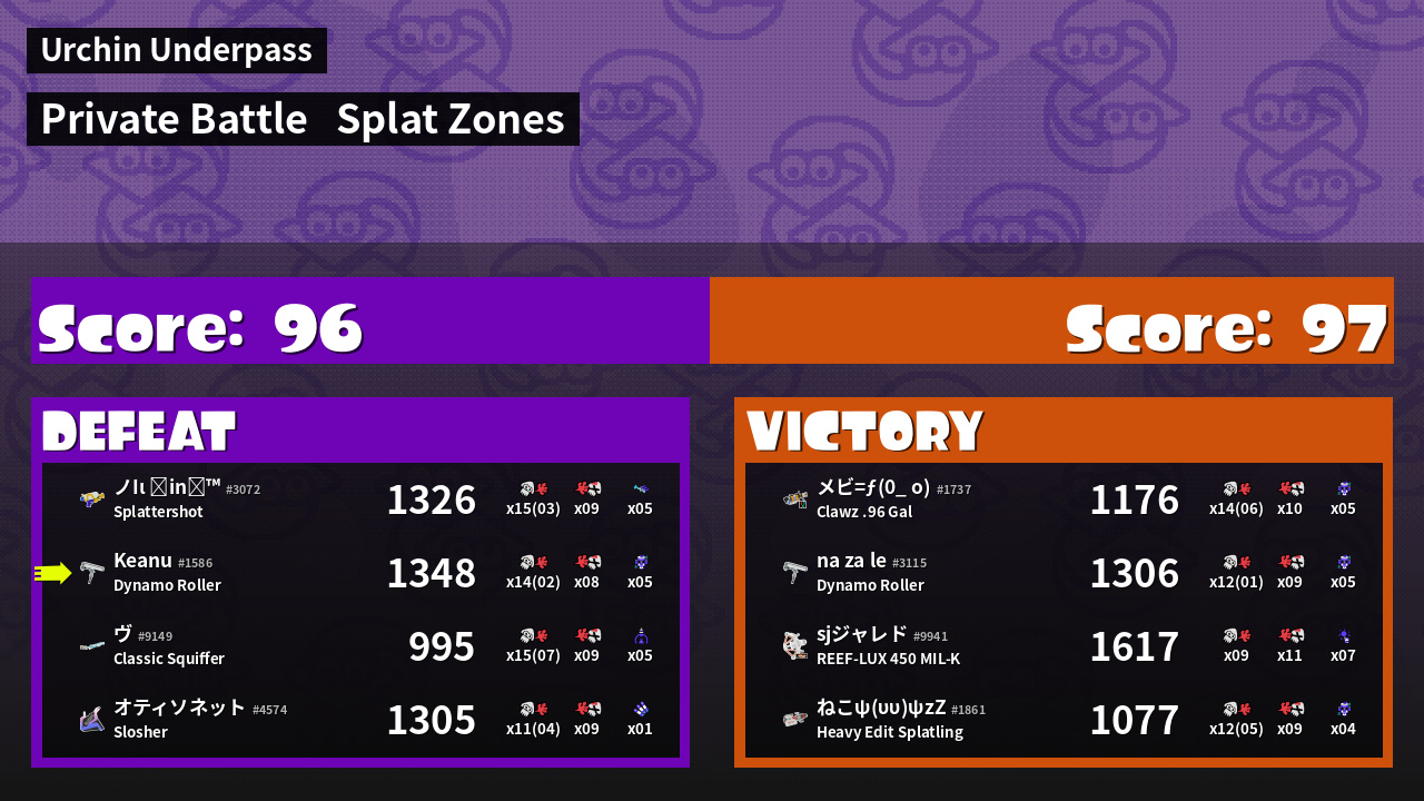 | Medals | #1 Turf Inker #1 Super Jump Spot #1 Enemy Splatter | ||