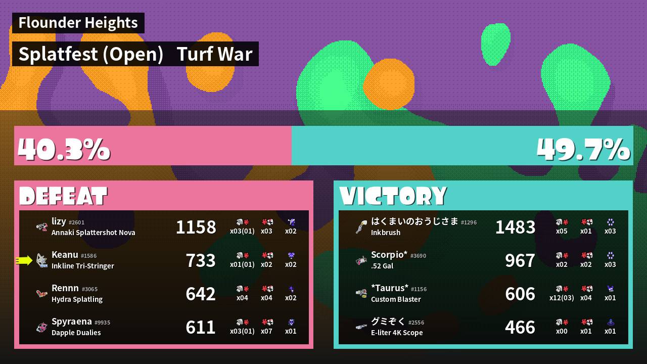 | Medals | #1 Enemy-Base Inker #1 Super Jump Spot #1 Splat Assister | ||