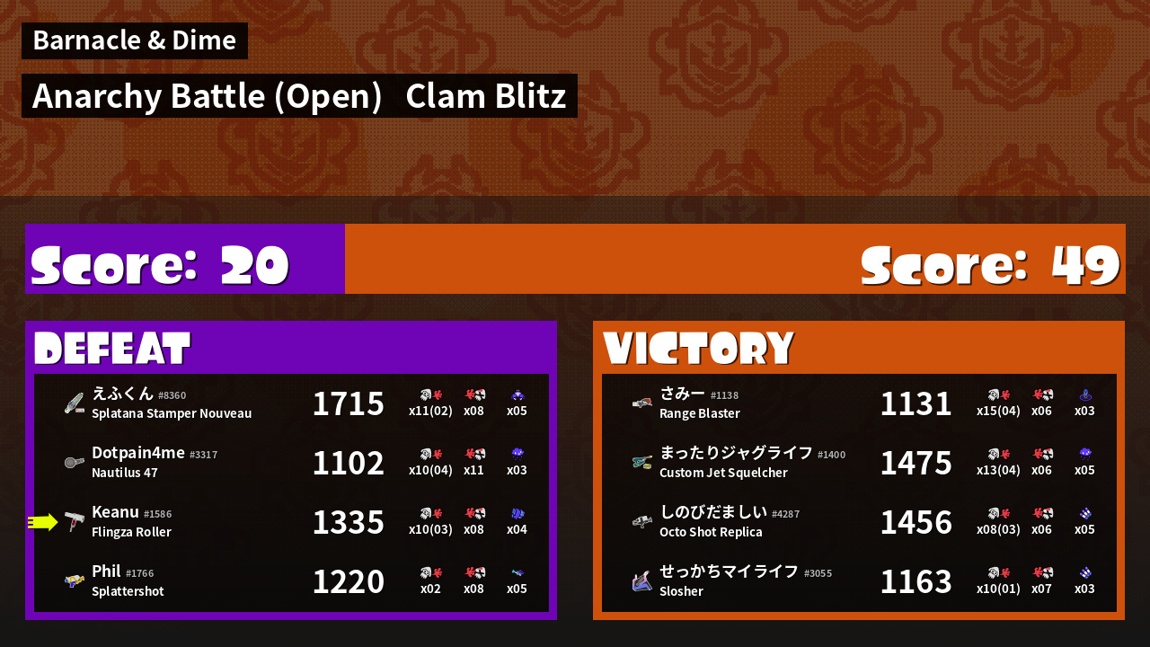 | Mode | Clam Blitz - Anarchy Battle (Open) | ||