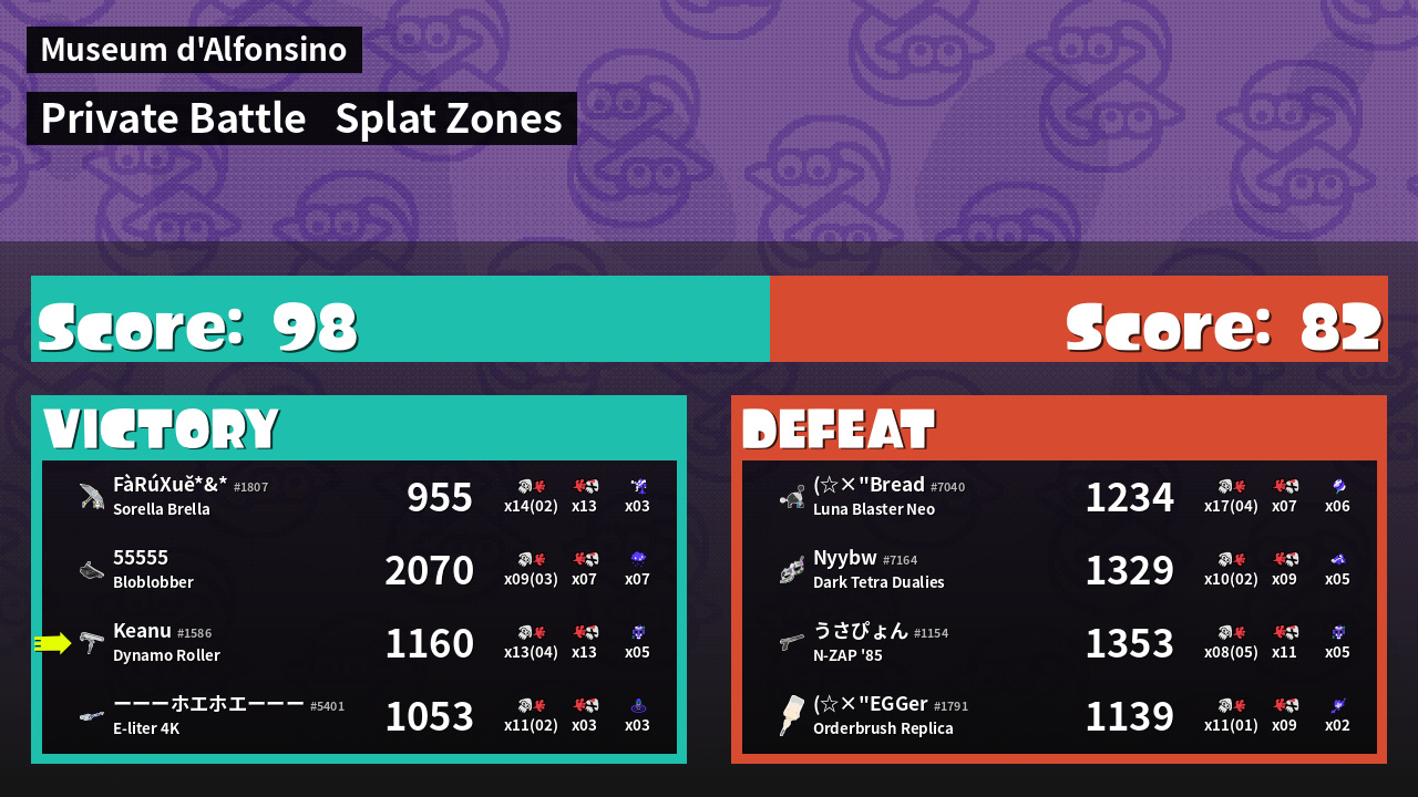 | Medals | #1 Splat Zone Guard #1 Splat Assister #1 Ground Traveler | ||