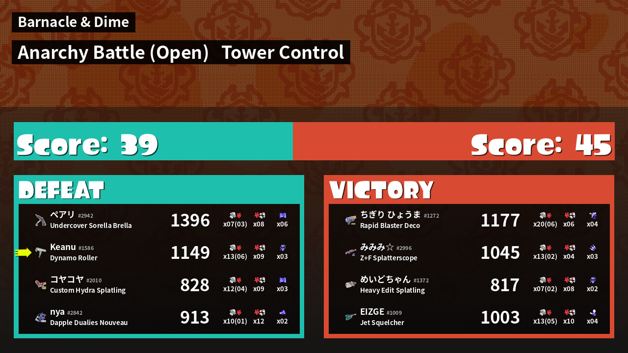 | Medals | #1 Overall Splatter #1 Splat Assister #1 Tower Stopper | ||