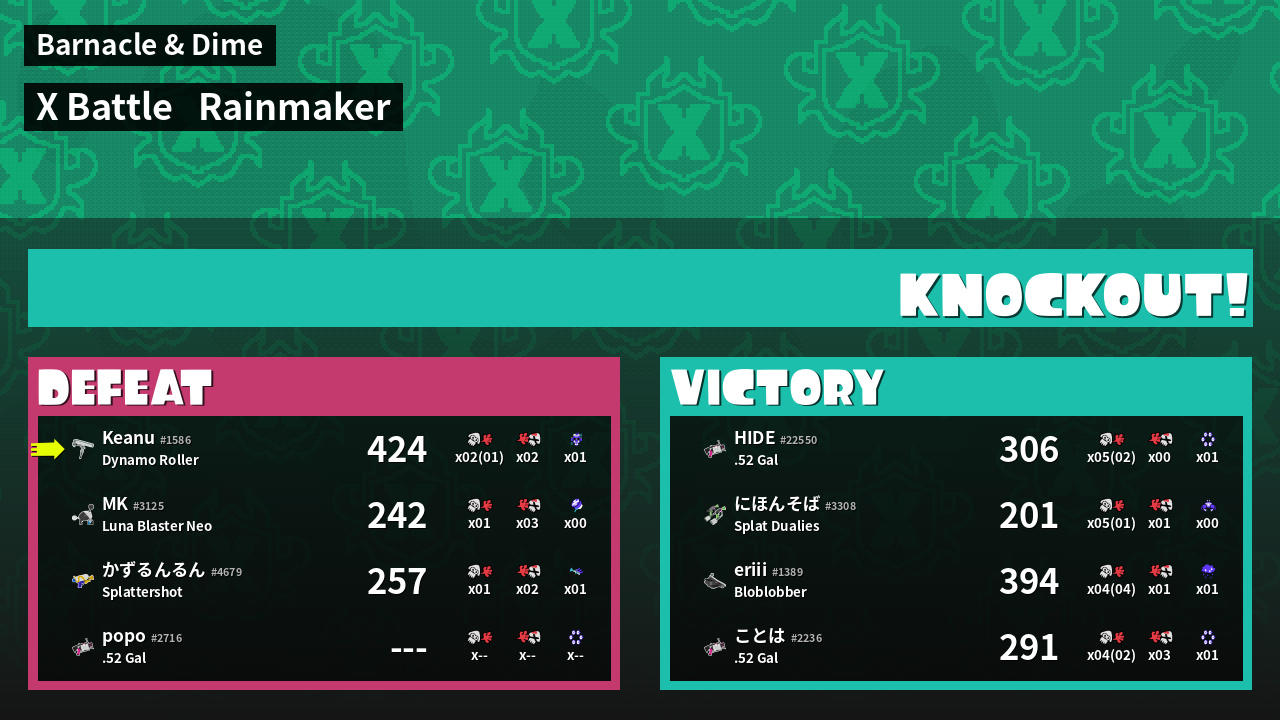 | Medals | #1 Overall Splatter #1 Turf Inker #1 Enemy Splatter | ||