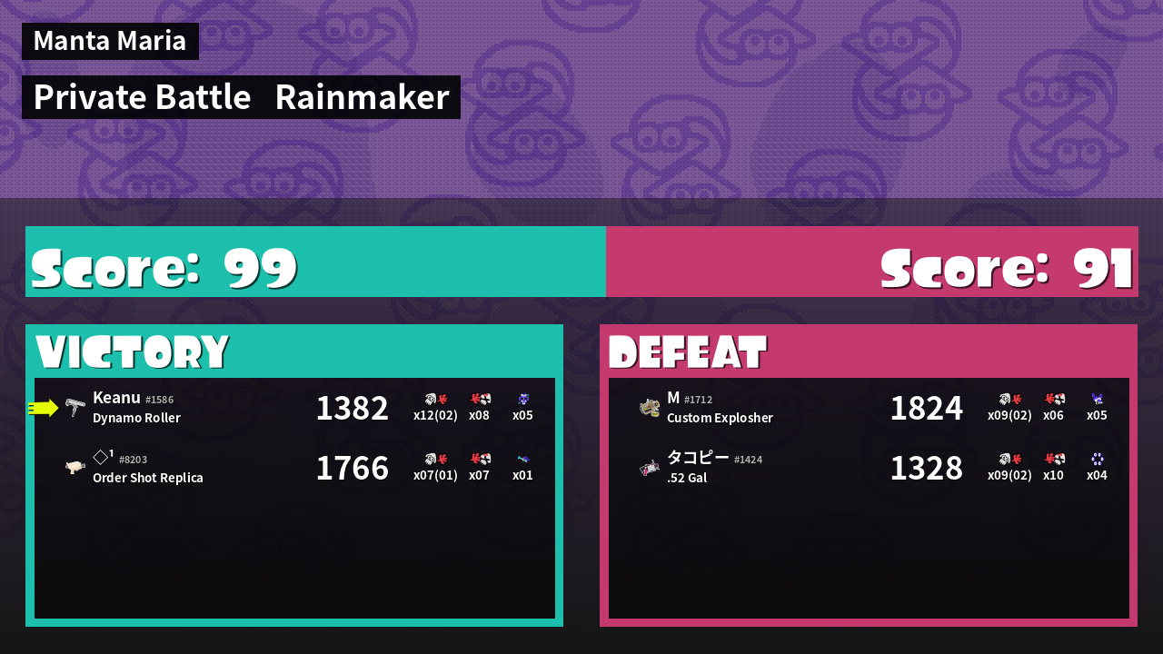 | Medals | #1 Overall Splatter #1 Enemy Splatter #1 Splat Assister | ||