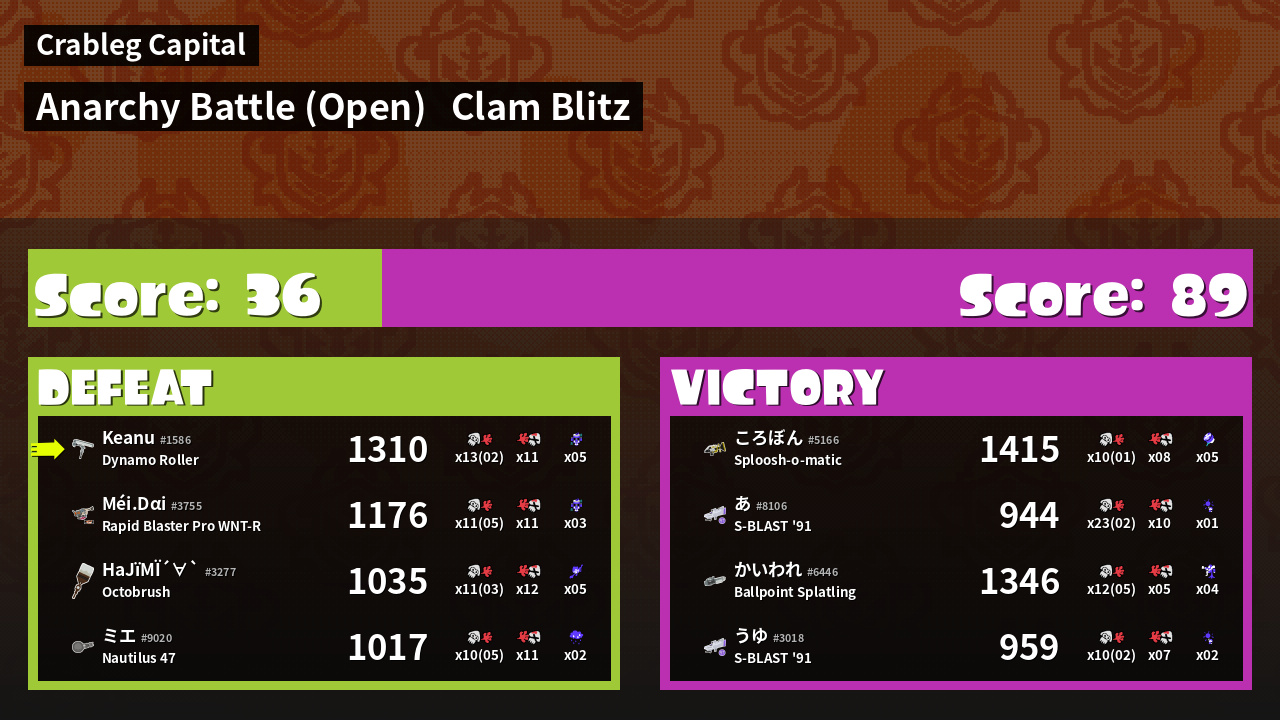 | Mode | Clam Blitz - Anarchy Battle (Open) | ||