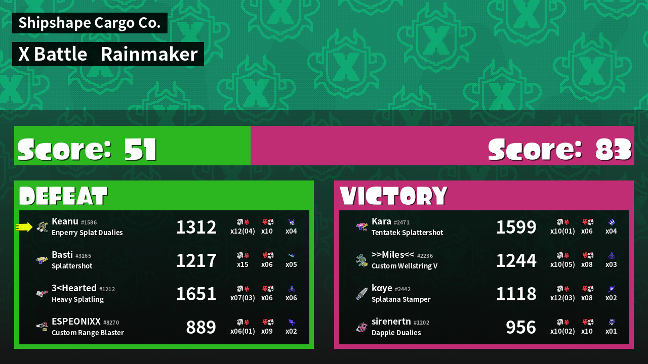 | Weapon | Enperry Splat Dualies ( Curling Bomb / Triple Splashdown) | ||
