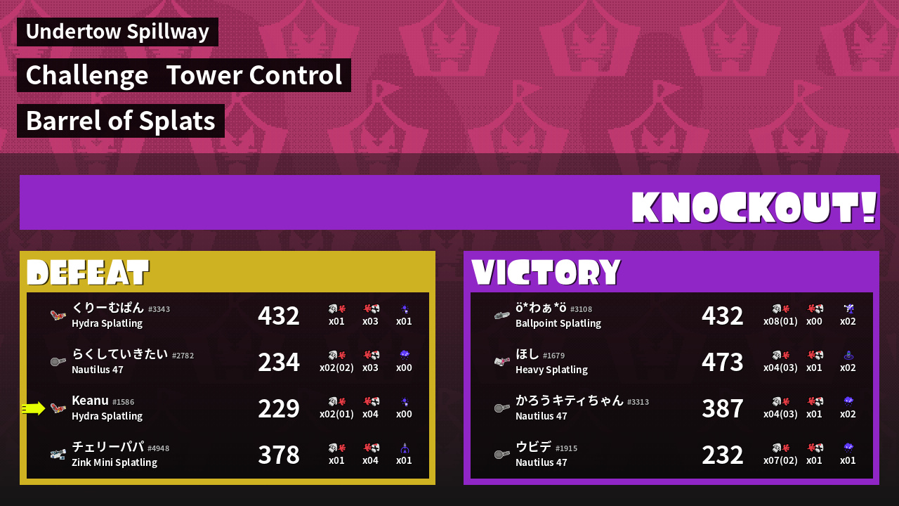| Medals | #1 Overall Splatter #1 Enemy Splatter First Splat! | ||