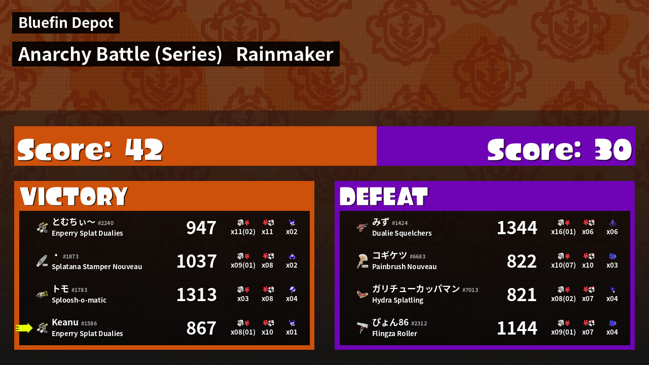 | Weapon | Enperry Splat Dualies ( Curling Bomb / Triple Splashdown) | ||