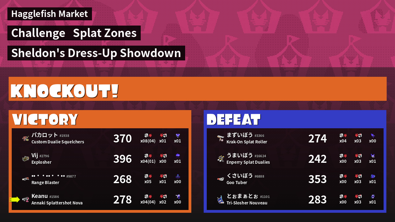 | Medals | #1 Splat Assister #1 Damage Taker #2 Splat Zone Guard | ||
