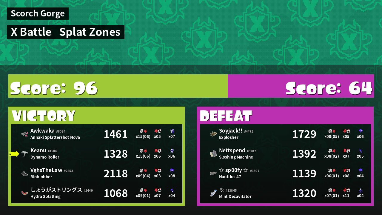 | Medals | #1 Overall Splatter #1 Splat Zone Guard #1 Enemy Splatter | ||