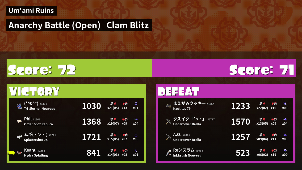 | Mode | Clam Blitz - Anarchy Battle (Open) | ||