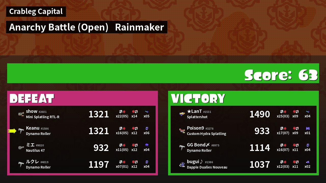 | Medals | #1 Turf Inker #1 Splat Assister #1 Rainmaker Stopper | ||