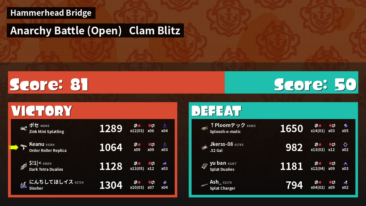 | Medals | #1 Score Booster #1 Clam Carrier #1 Enemy Splatter | ||