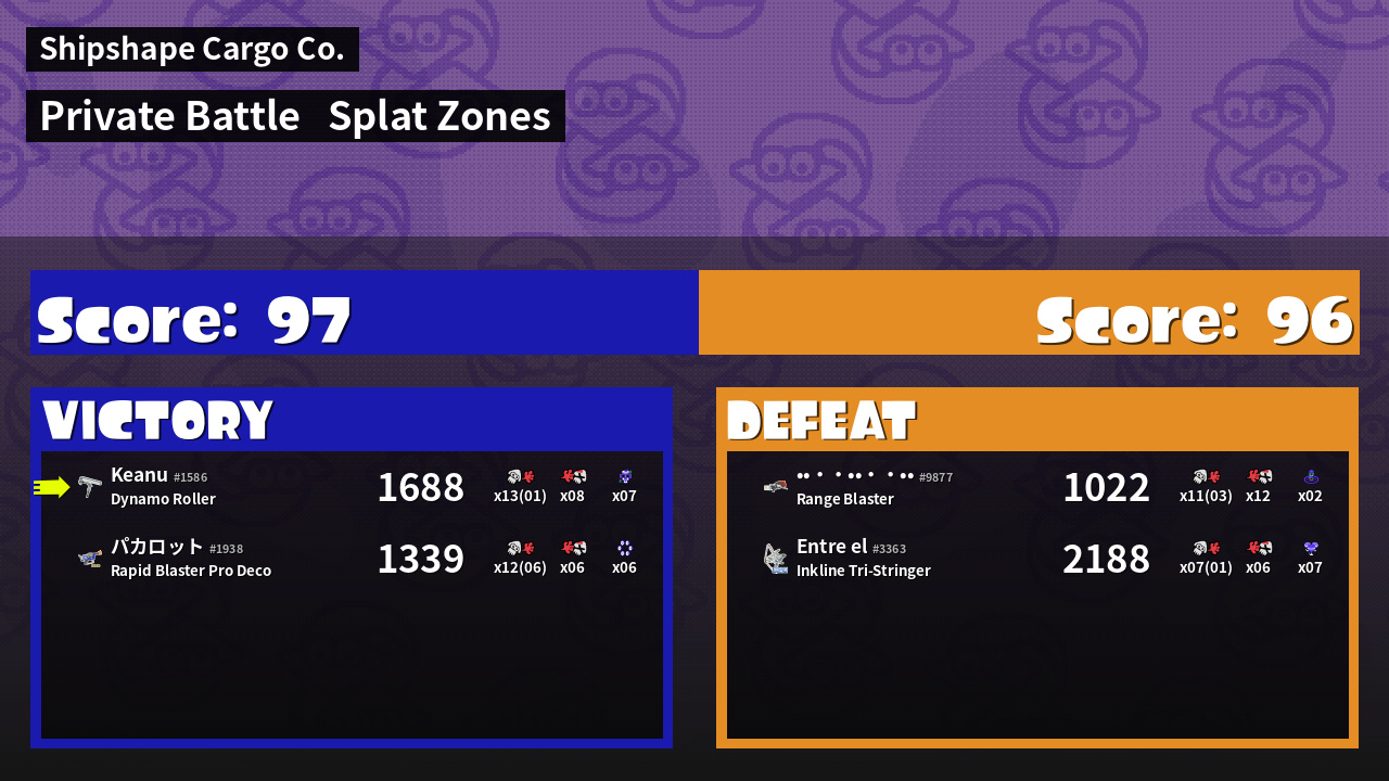 | Mode | Splat Zones - Private Battle | ||