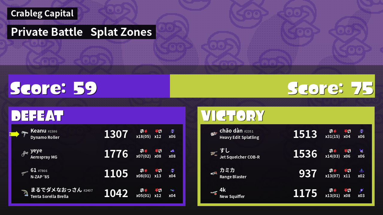 | Mode | Splat Zones - Private Battle | ||