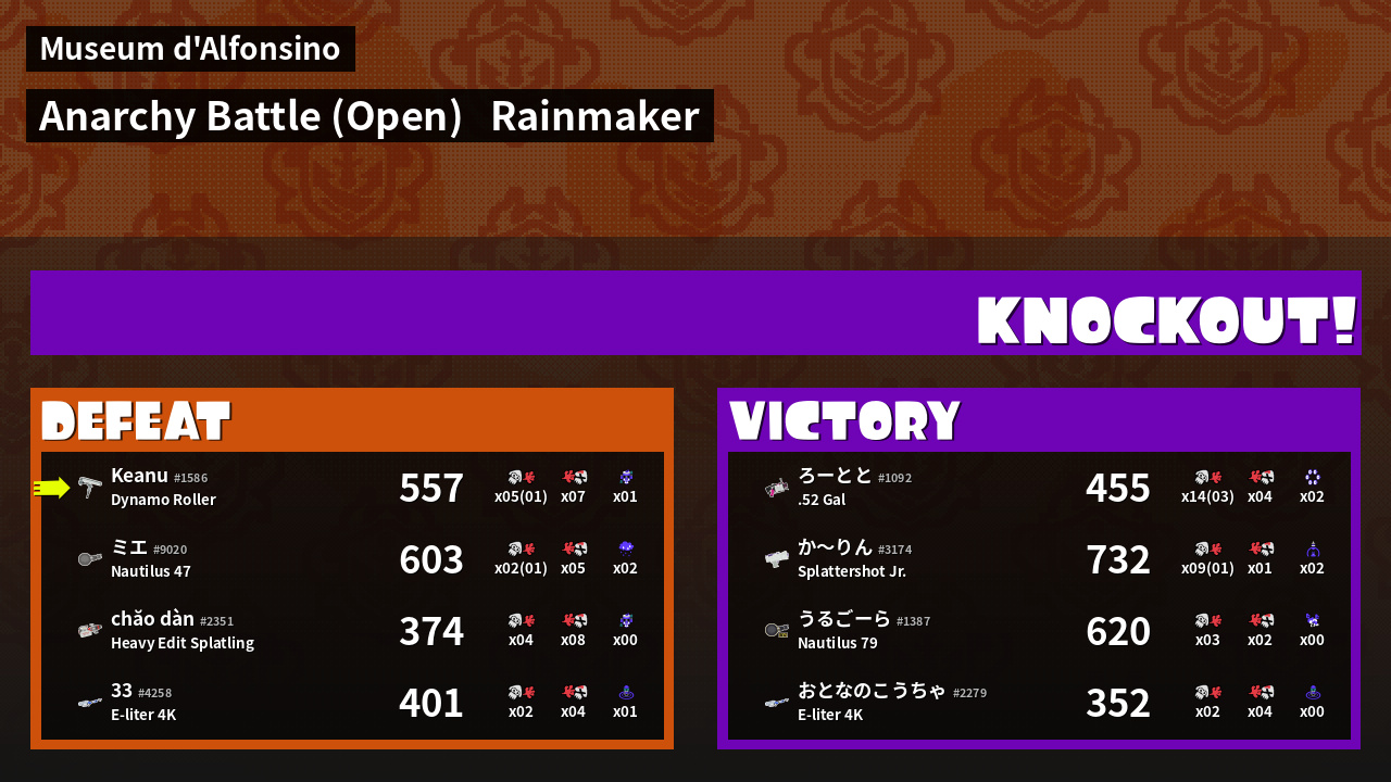| Medals | #1 Overall Splatter #1 Enemy Splatter #1 Splat Assister | ||
