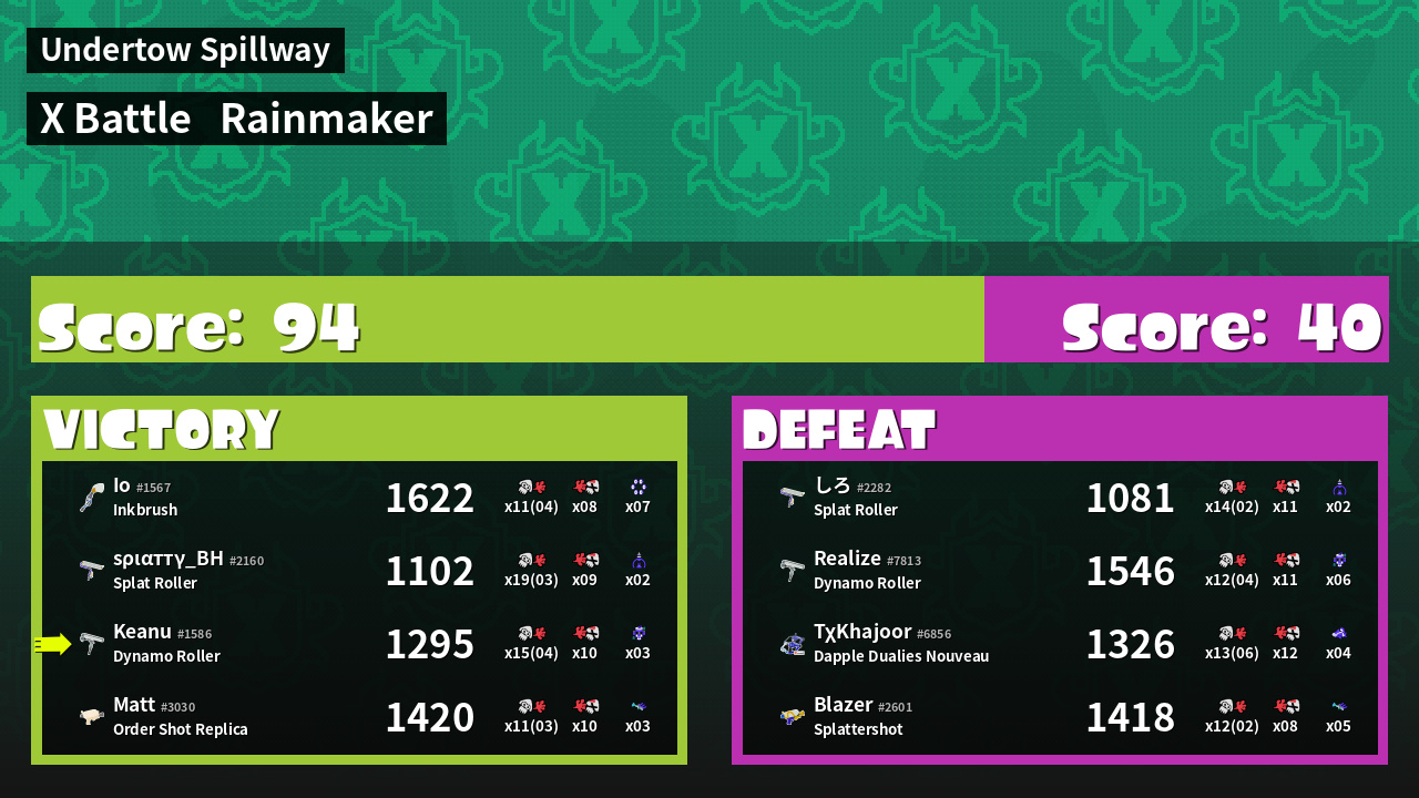 | Medals | #1 Splat Assister #1 Rainmaker Carrier First Splat! | ||