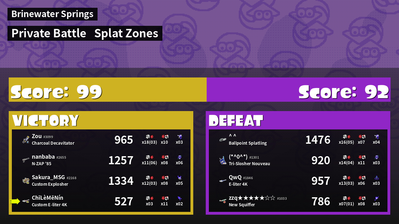 | Mode | Splat Zones - Private Battle | ||