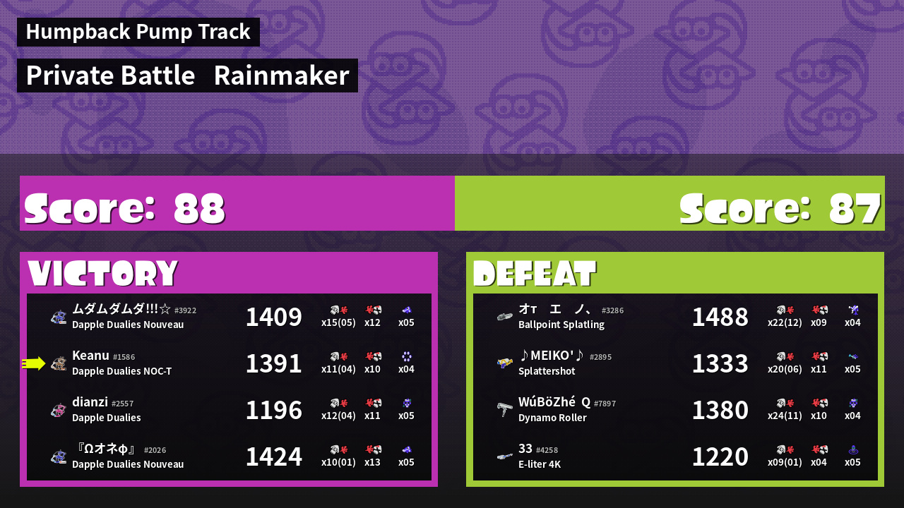 | Weapon | Dapple Dualies NOC-T ( Splat Bomb / Killer Wail 5.1) | ||