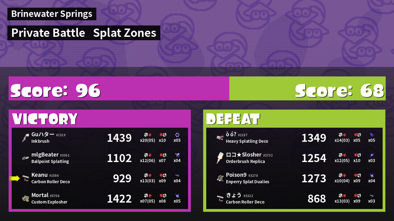 | Medals | #1 Trizooka User #2 Overall Splatter #2 Splat Zone Guard | ||
