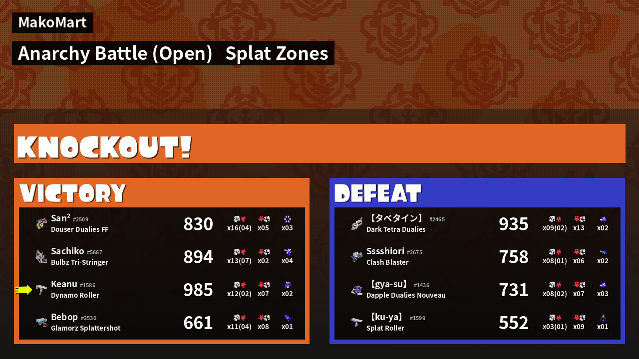 | 有组织力的侦探  【ku-ya】 #1599 |  Splat Roller                    | 552 | 2 + 1 | 9 | 0.22 |  1 | |