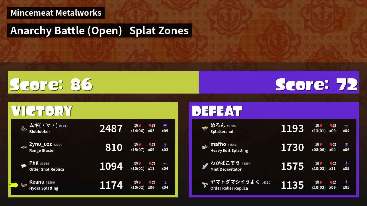 | Mode | Splat Zones - Anarchy Battle (Open) | ||