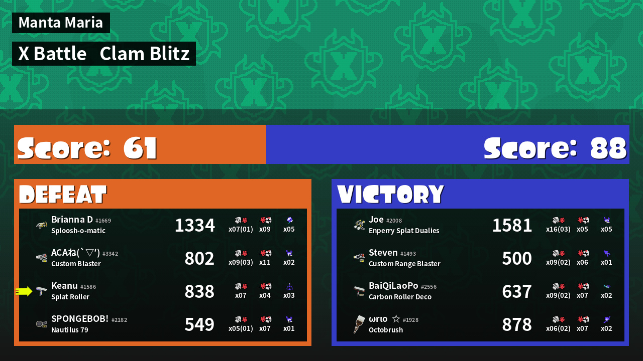 | Mode | Clam Blitz - X Battle | ||