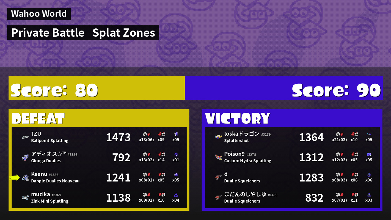| Mode | Splat Zones - Private Battle | ||