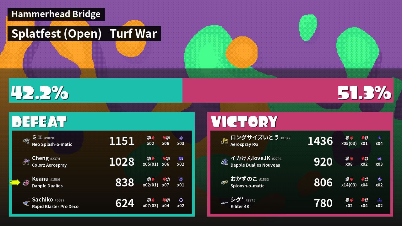 | Medals | #1 Enemy-Base Inker #1 Super Jump Spot #2 Splat Assister | ||