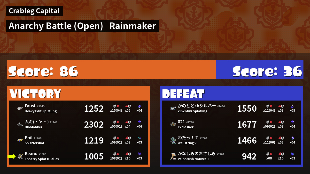 | Medals | #1 Rainmaker Stopper #1 Ink Consumer #2 Splat Assister | ||