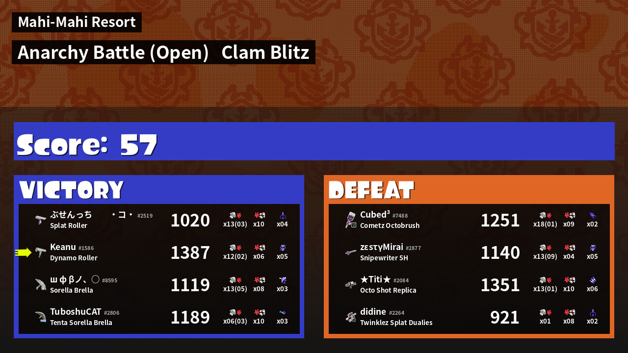 | Mode | Clam Blitz - Anarchy Battle (Open) | ||
