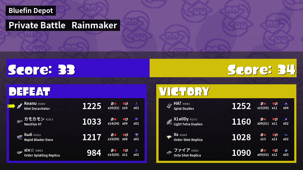 | Medals | #1 Overall Splatter #1 Turf Inker #1 Enemy Splatter | ||