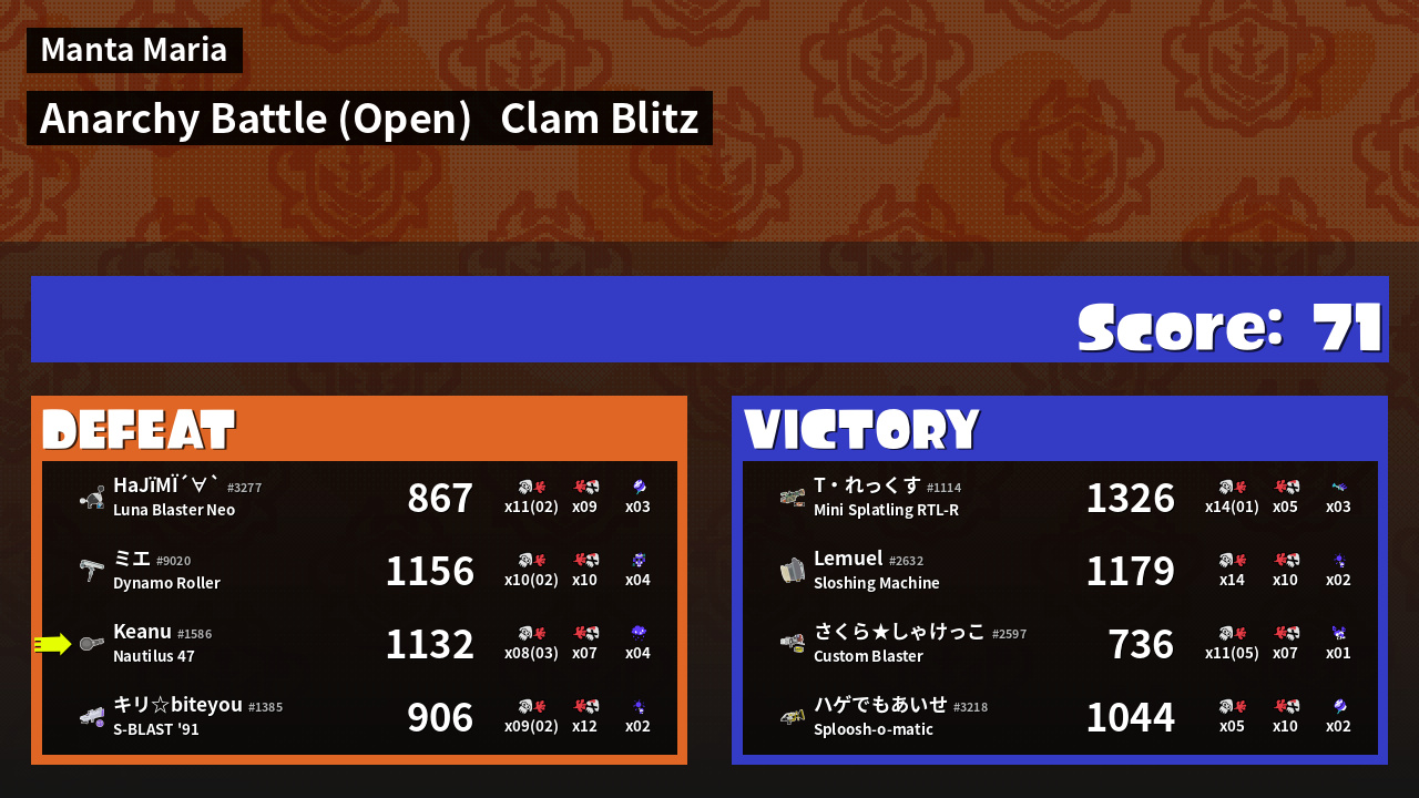 | Mode | Clam Blitz - Anarchy Battle (Open) | ||