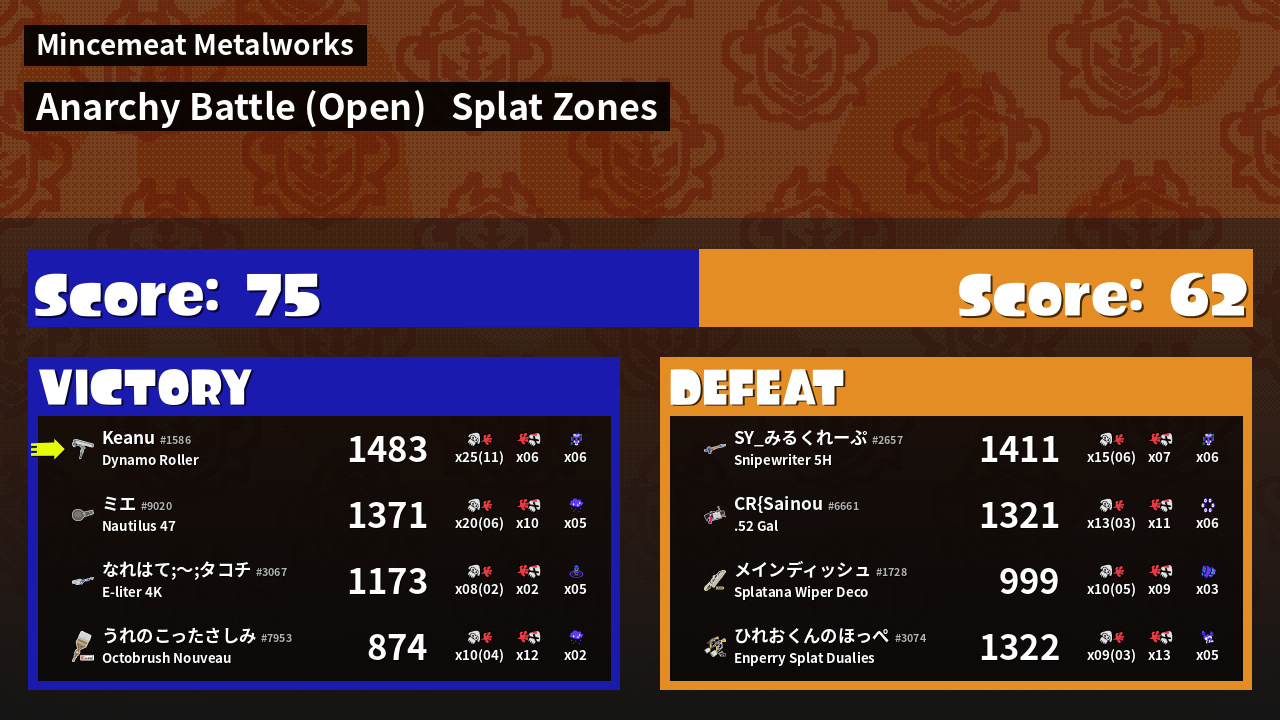 | Mode | Splat Zones - Anarchy Battle (Open) | ||
