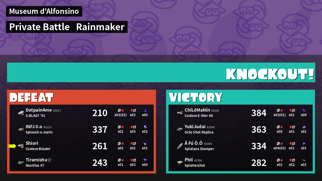 | Medals | #1 Enemy Splatter #1 Damage Taker #2 Overall Splatter | ||