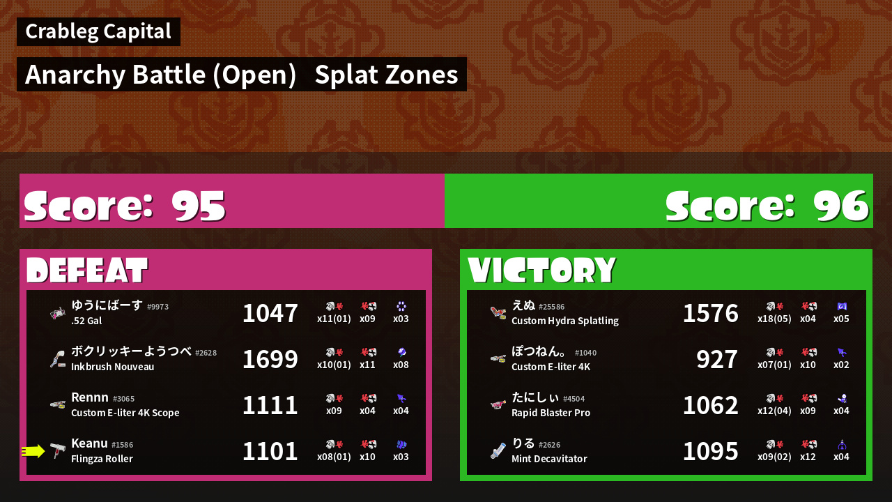 | Mode | Splat Zones - Anarchy Battle (Open) | ||