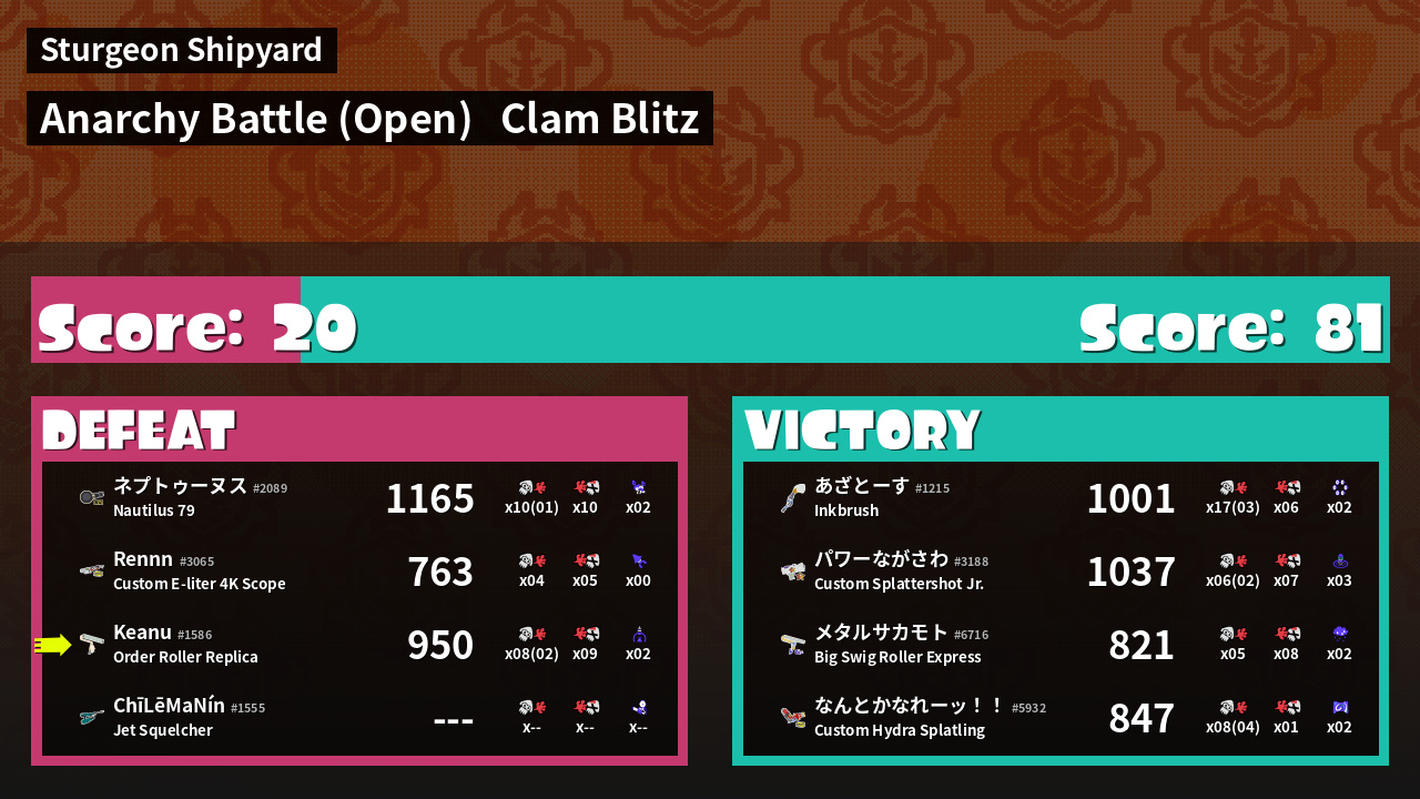 | Mode | Clam Blitz - Anarchy Battle (Open) | ||