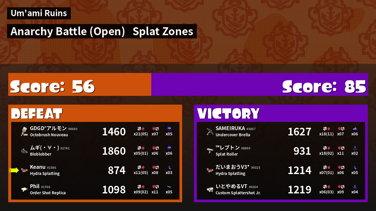 | Mode | Splat Zones - Anarchy Battle (Open) | ||
