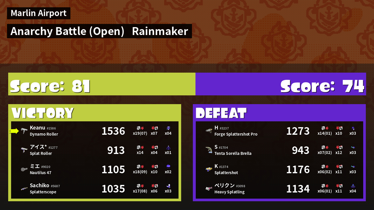 | Name | Weapon | Inked |  k |  d | KR | Sp | |
