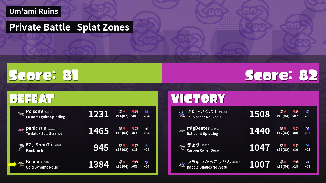 | Medals | #1 Splat Zone Hero #1 Damage Taker #1 Ink Consumer | ||