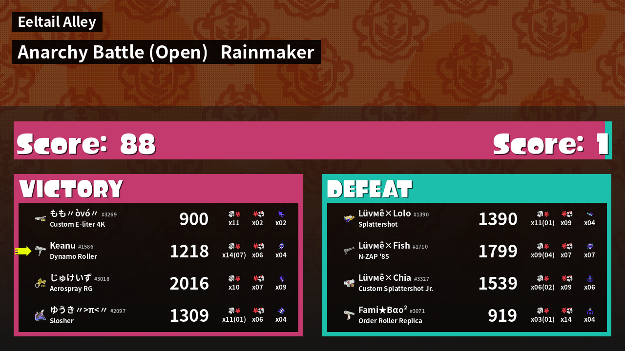 | Medals | #1 Overall Splatter #1 Splat Assister #1 Rainmaker Stopper | ||