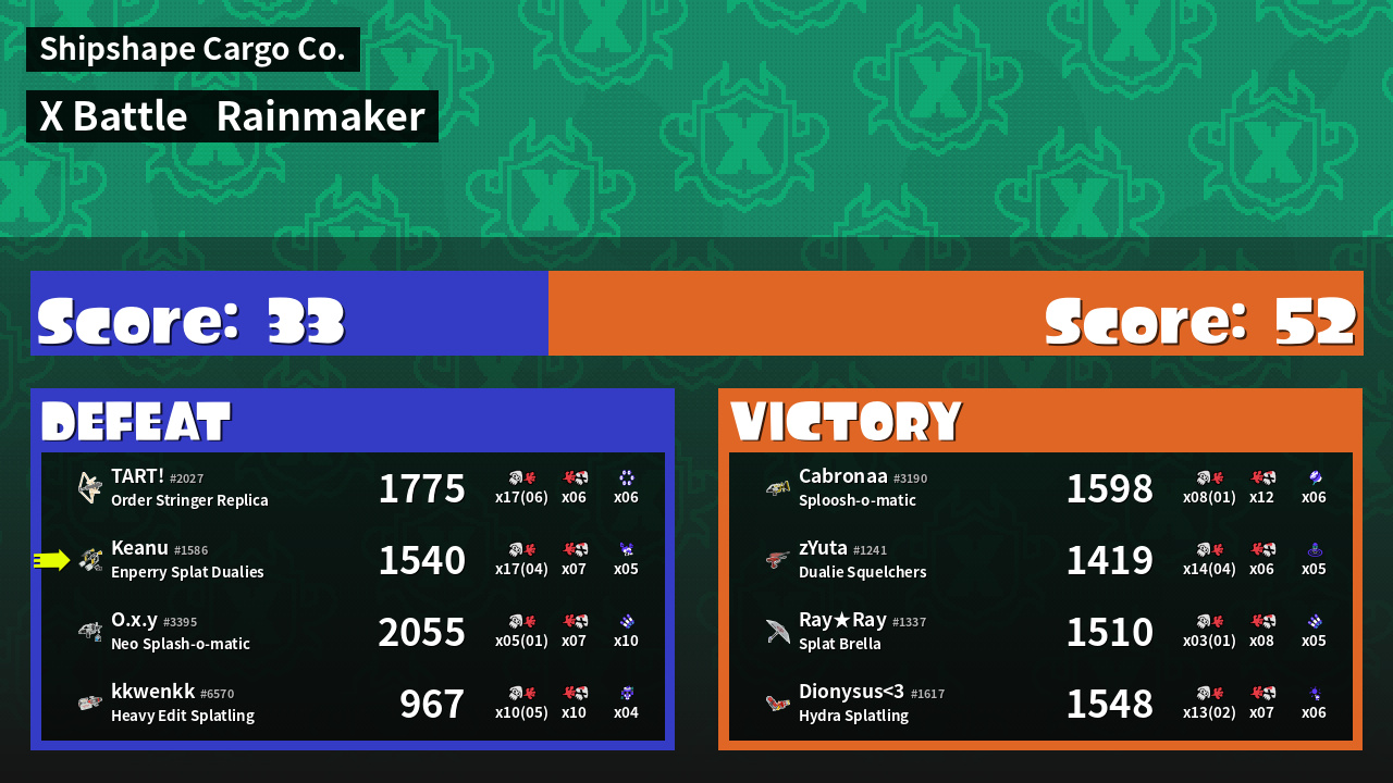 | Weapon | Enperry Splat Dualies ( Curling Bomb / Triple Splashdown) | ||