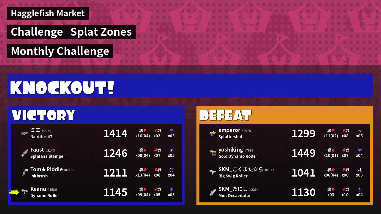 | Medals | #1 Splat Assister #1 Tacticooler User #2 Splat Zone Guard | ||