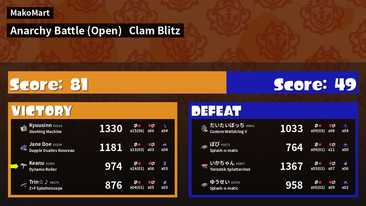 | Mode | Clam Blitz - Anarchy Battle (Open) | ||