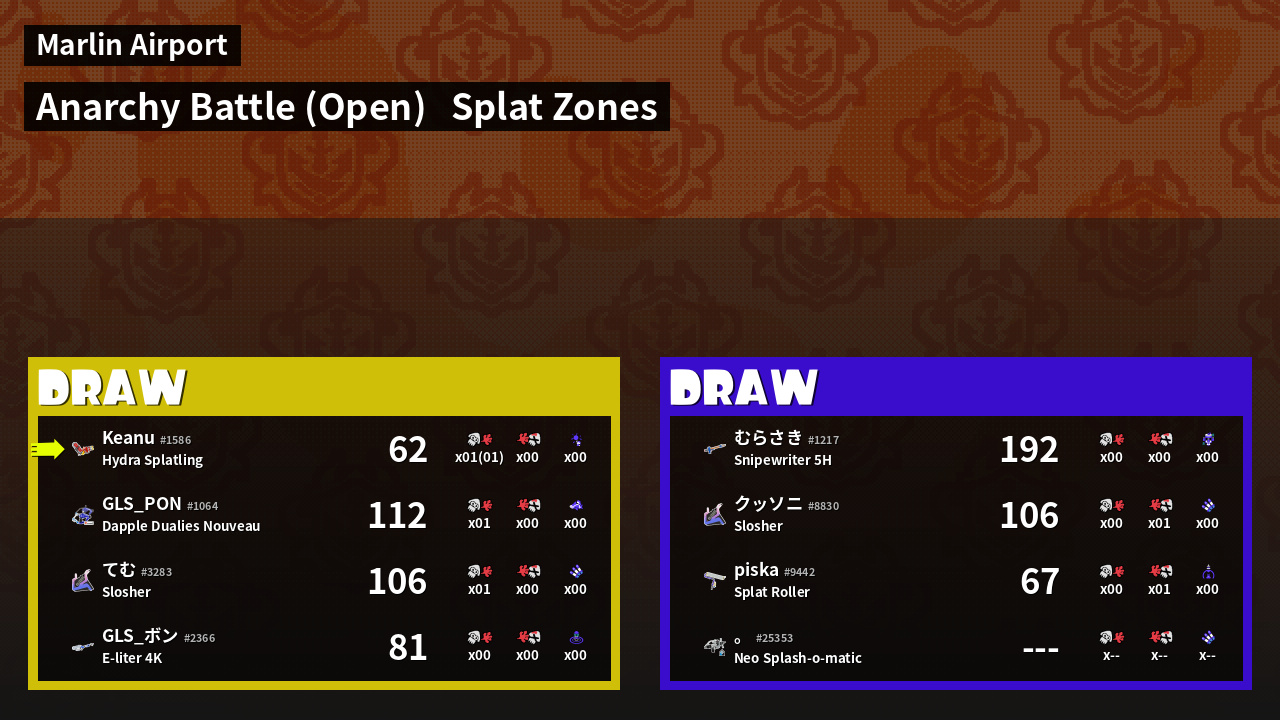 | Mode | Splat Zones - Anarchy Battle (Open) | ||