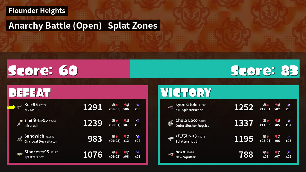 | Mode | Splat Zones - Anarchy Battle (Open) | ||