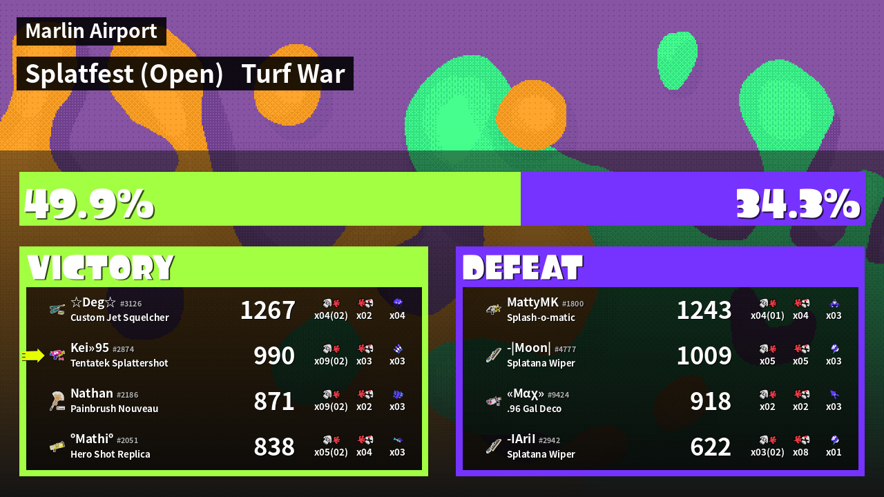 | Medals | #1 Overall Splatter #1 Enemy-Base Inker #1 Enemy Splatter | ||
