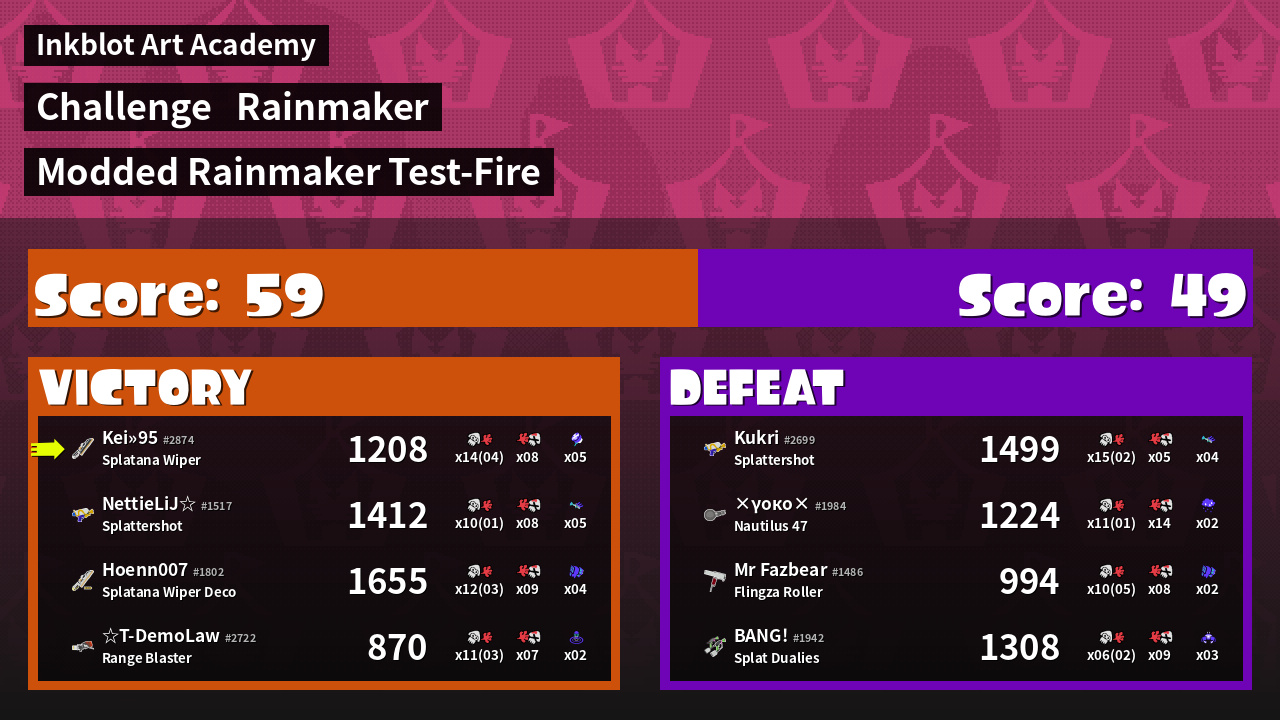 | Medals | #1 Overall Splatter #1 Enemy Splatter #1 Splat Assister | ||
