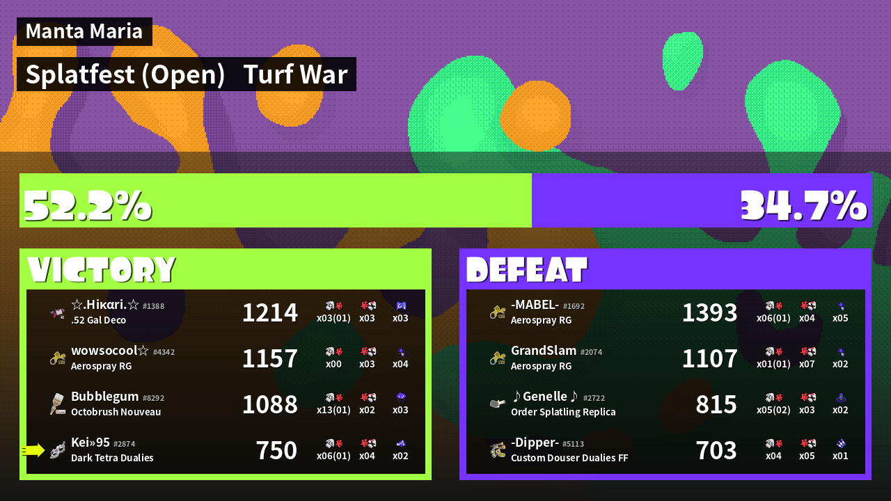 | Medals | #1 Enemy-Base Inker #1 Splat Assister #1 Reefslider User | ||