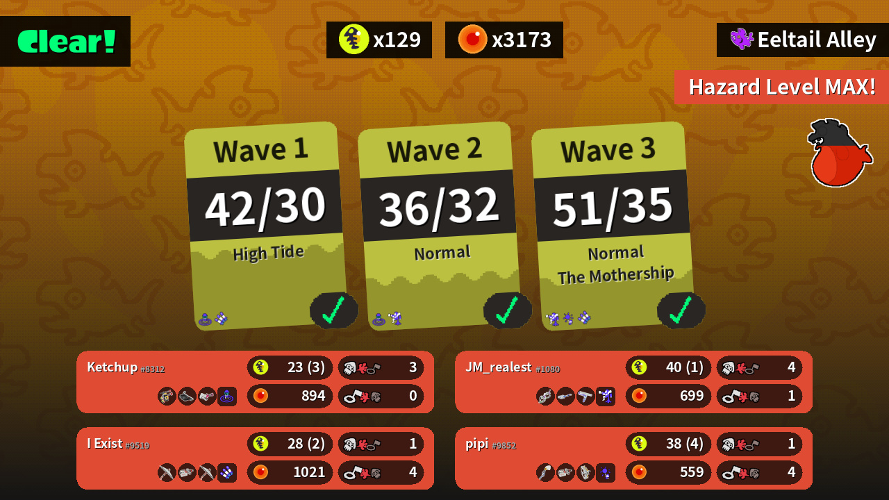 | Weapons | Douser Dualies FF Bloblobber Heavy Splatling | Dark Tetra Dualies E-liter 4K Big Swig Roller | Inkbrush Heavy Edit Splatling Grizzco Stringer | Recycled Brella 24 Mk I Heavy Edit Splatling Recycled Brella 24 Mk I |